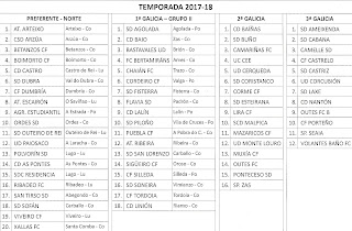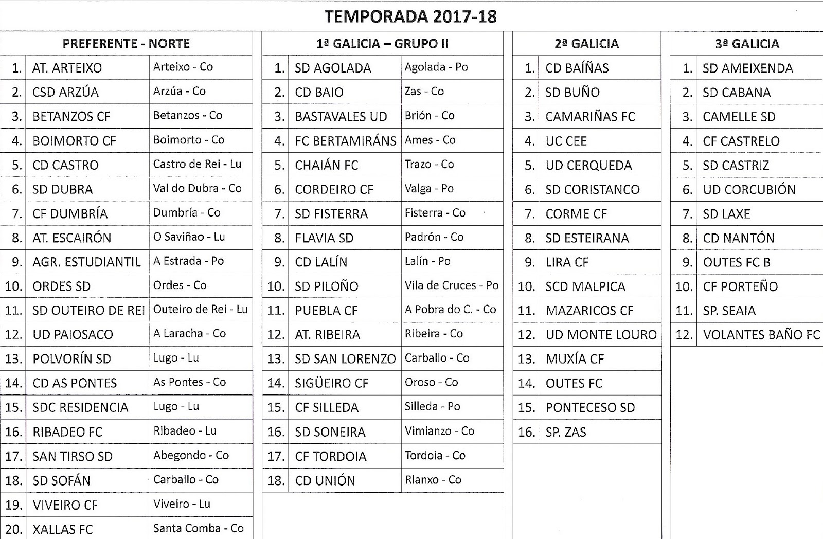 Xa podemos ofrecer o organigrama da temporada 2017-18, unha vez se definiron coas promocións de ascenso todas as categorías nas que figuran os equipos costeiros. Na Preferente Grupo Norte competirán 3 equipos da Costa (CF Dumbría, SD Sofán e Xallas FC); en total, serán 12 equipos da provincia coruñesa, 7 da de Lugo e 1 da de Pontevedra. Na 1ª Galicia, no seu Grupo 2, compiten este ano só catro equipos da Costa (CD Baio, SD Fisterra, SD San Lorenzo e SD Soneira); cinco serán os equipos pontevedreses e outros catro da comarca do Barbanza, como desprazamentos máis lonxanos. A Liga da Costa, na 2ª Galicia Grupo 2, contará esta vindeira temporada coa novidade de volver ser 16 equipos, coas novidades dos descendidos Outes FC e Sp. Zas e os ascendidos Muxía CF e Lira CF. O obxectivo de reducir a Liga da Costa foi aumentar o grupo costeiro da 3ª Galicia, que en principio contaría con 12 equipos, a falta de confirmar a presenza de todos os que competiron esta última temporada e que non apareza ningún outro novo (con rumores de reaparición do Muros SD).